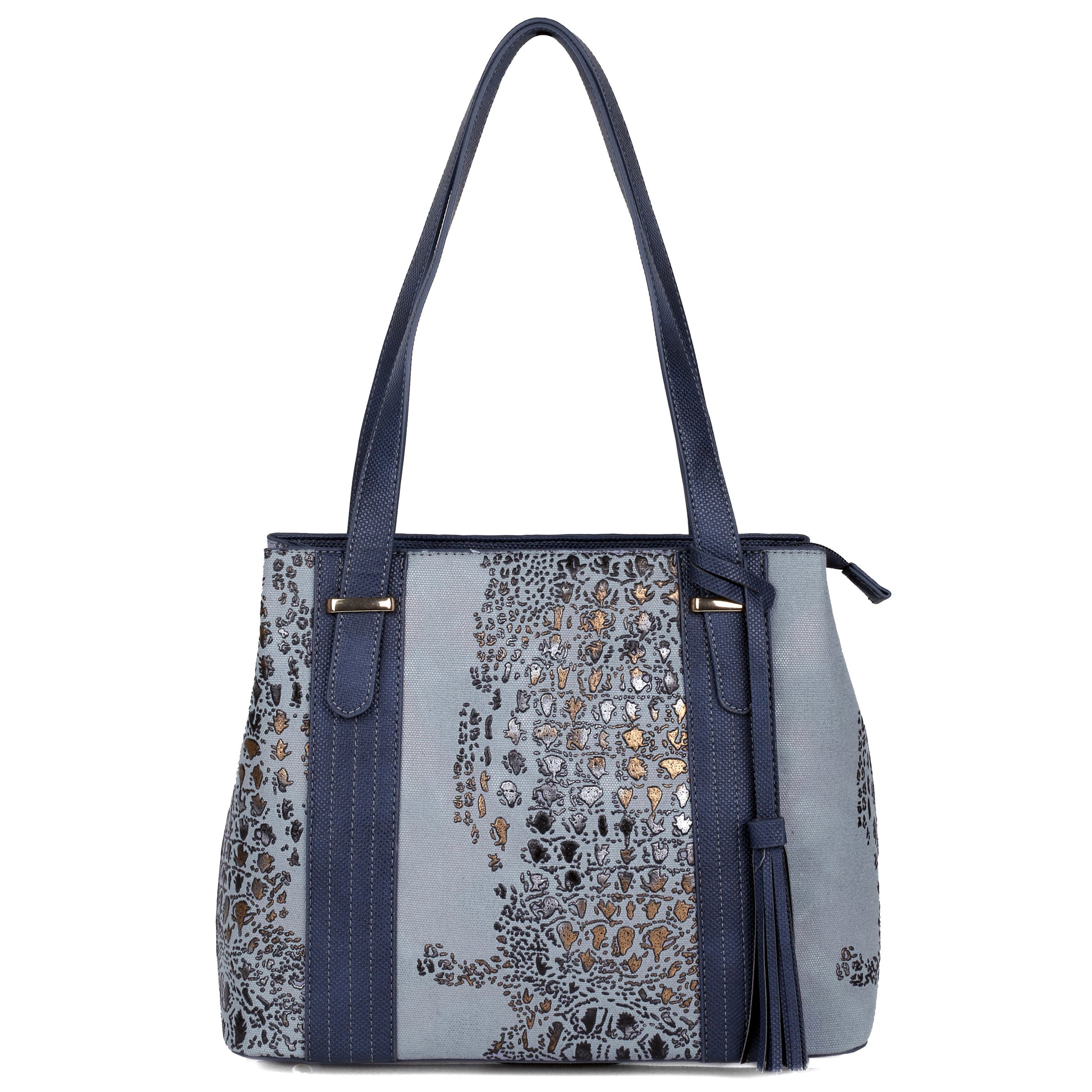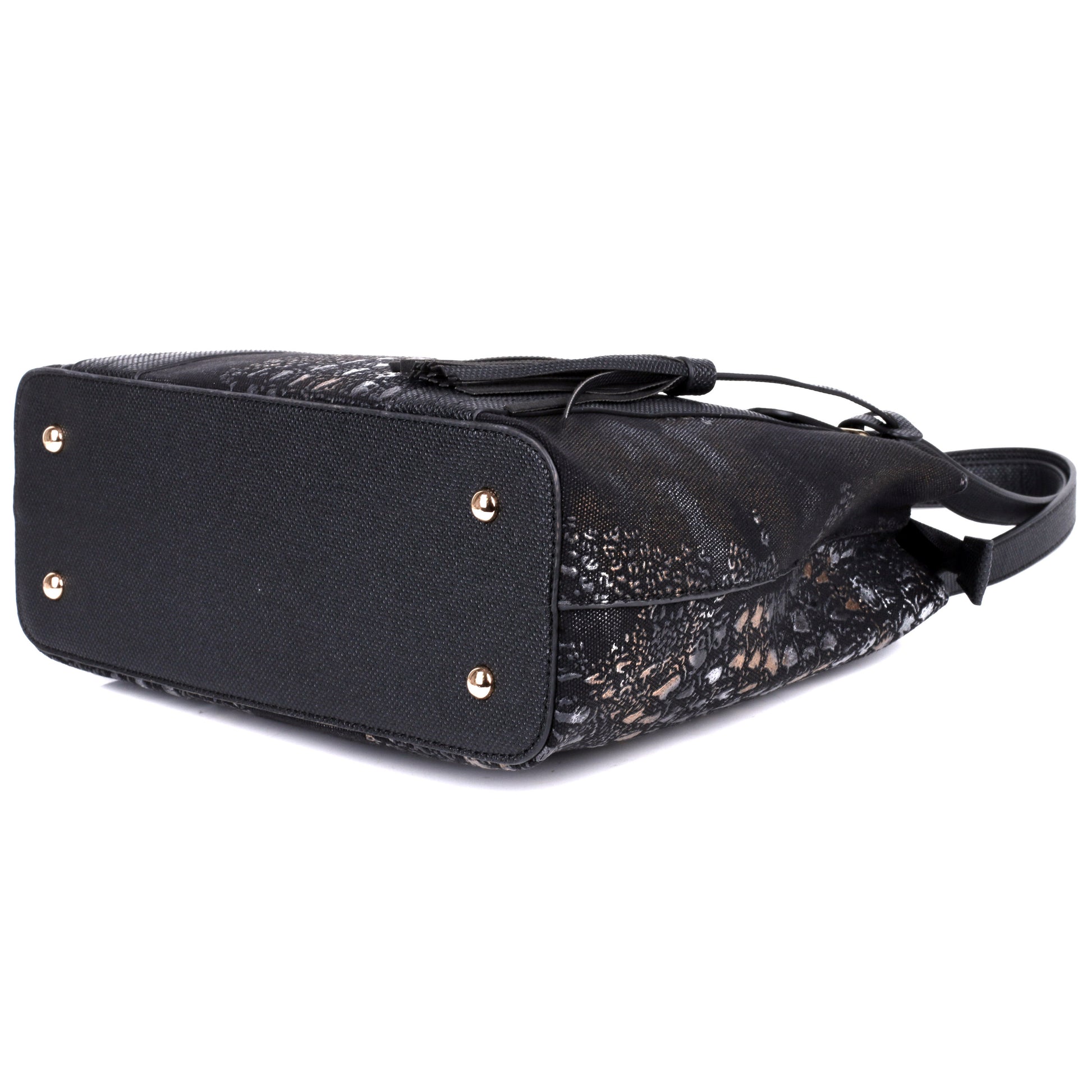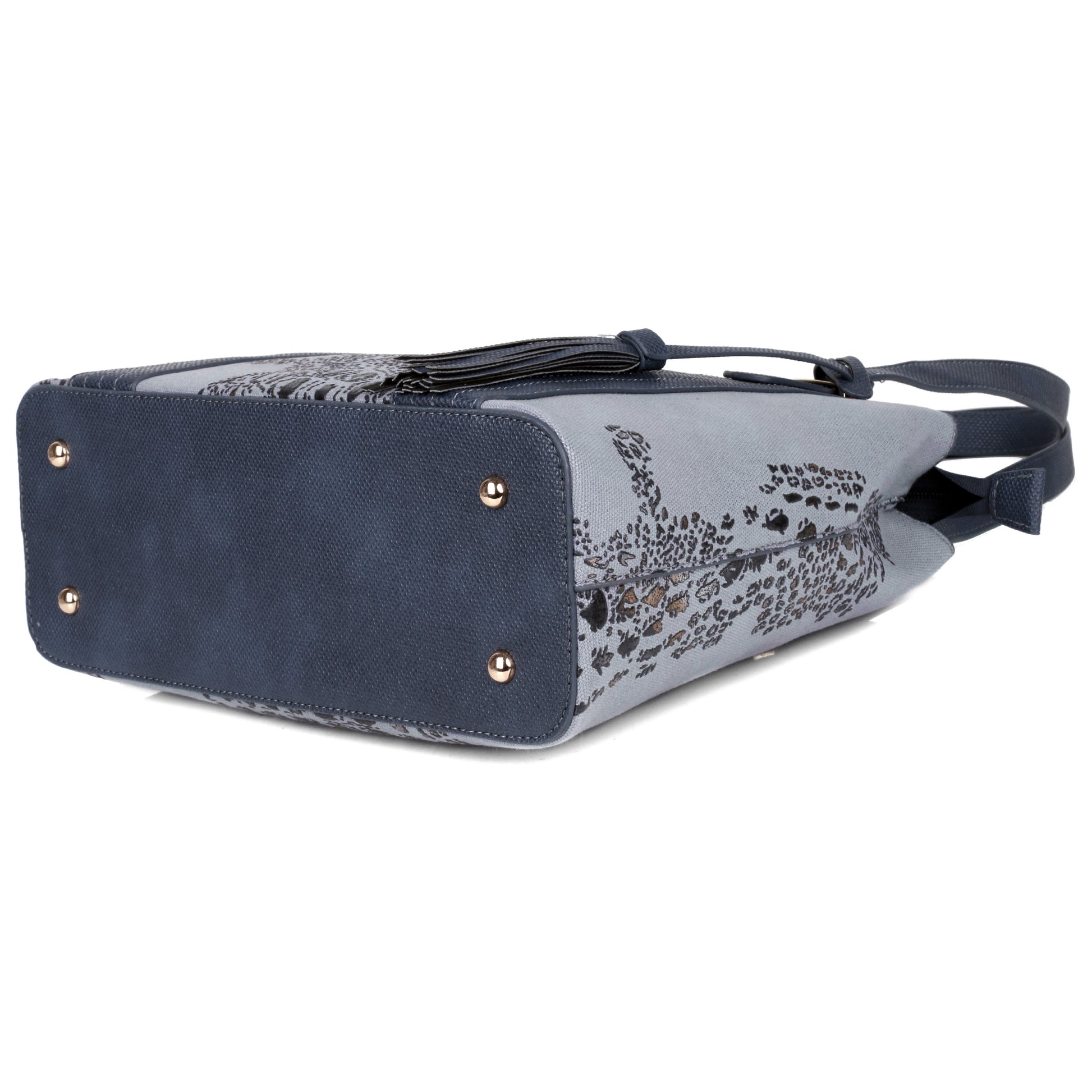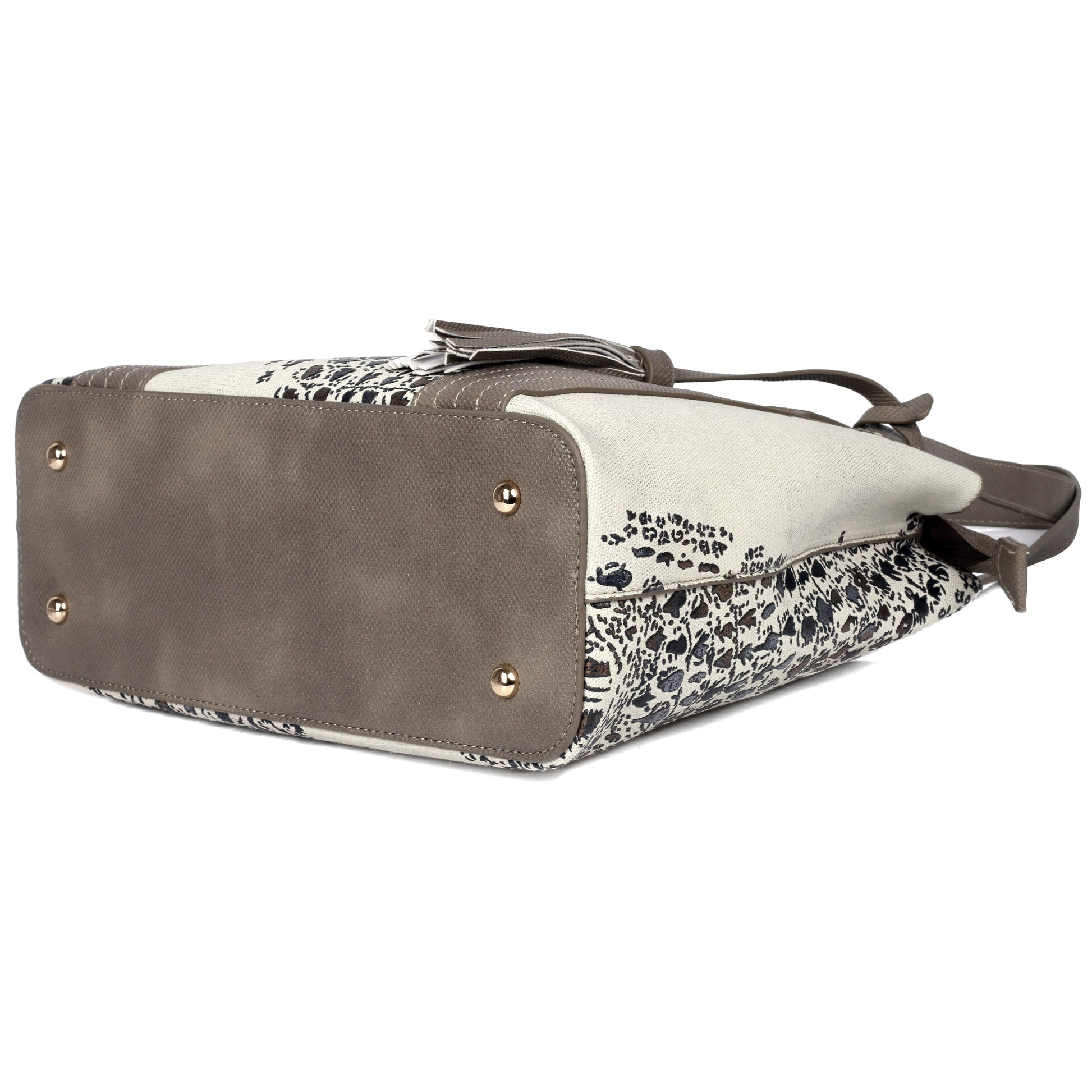 Eva tote bag features unique textural interplay of textile vegan leather and raised print.