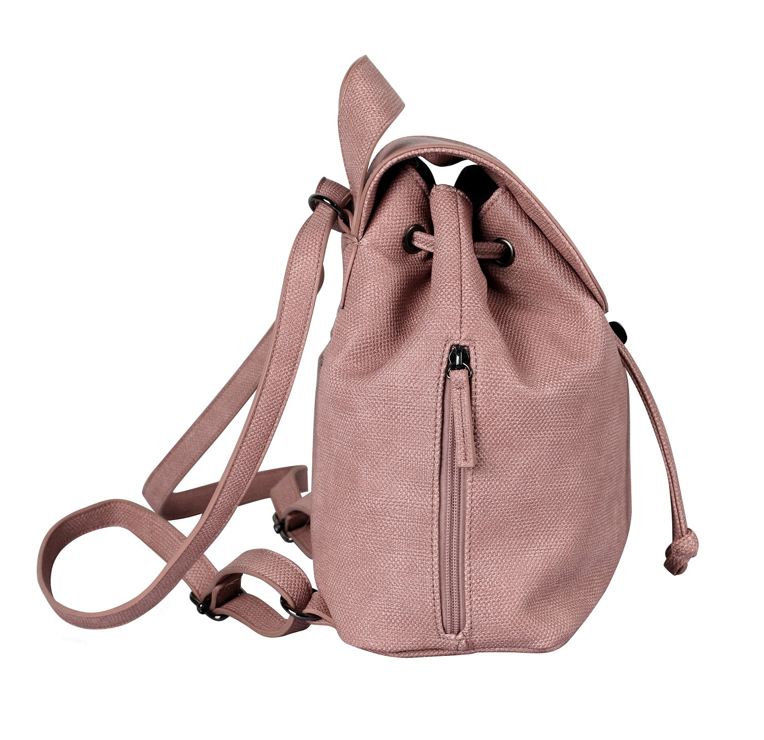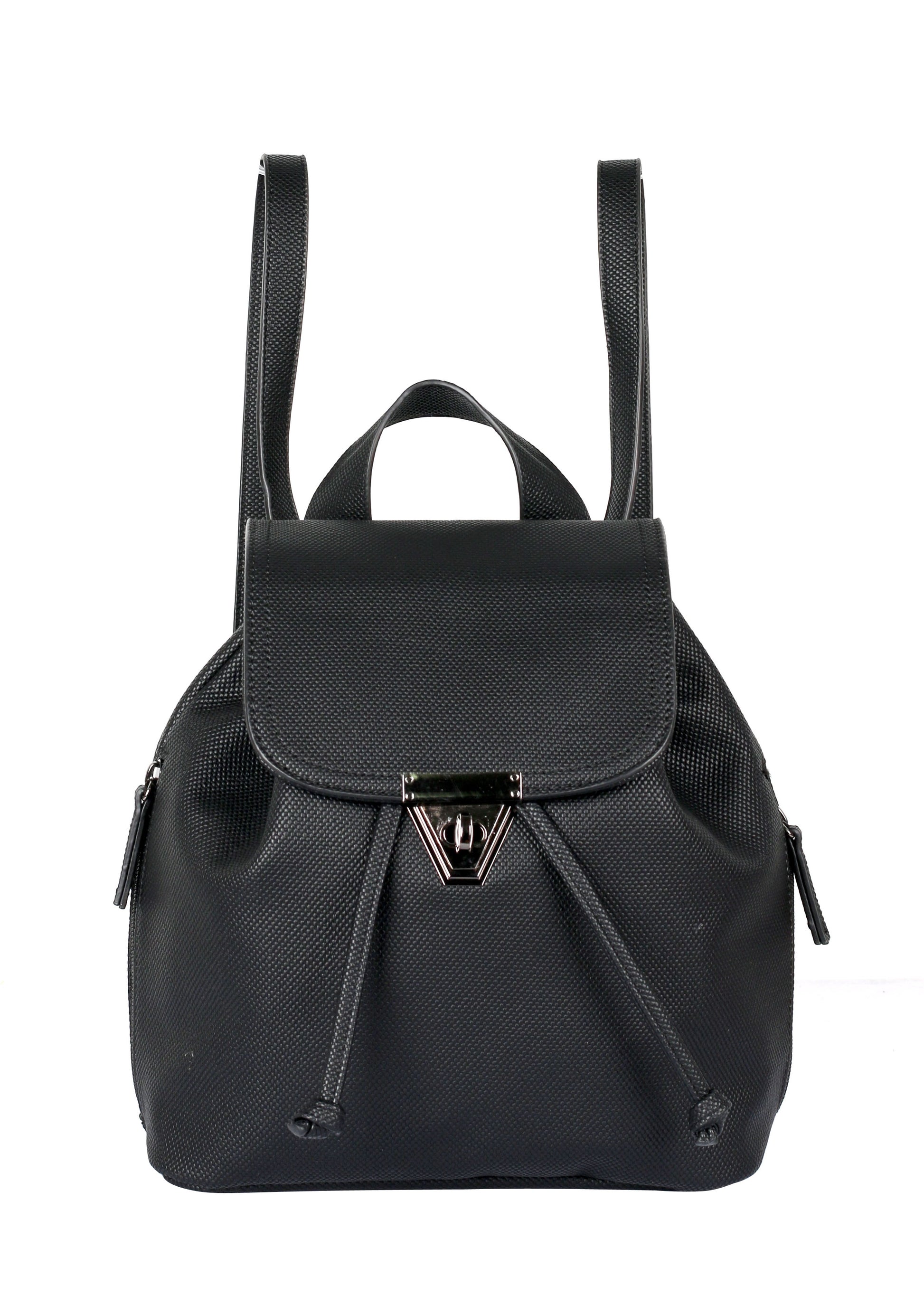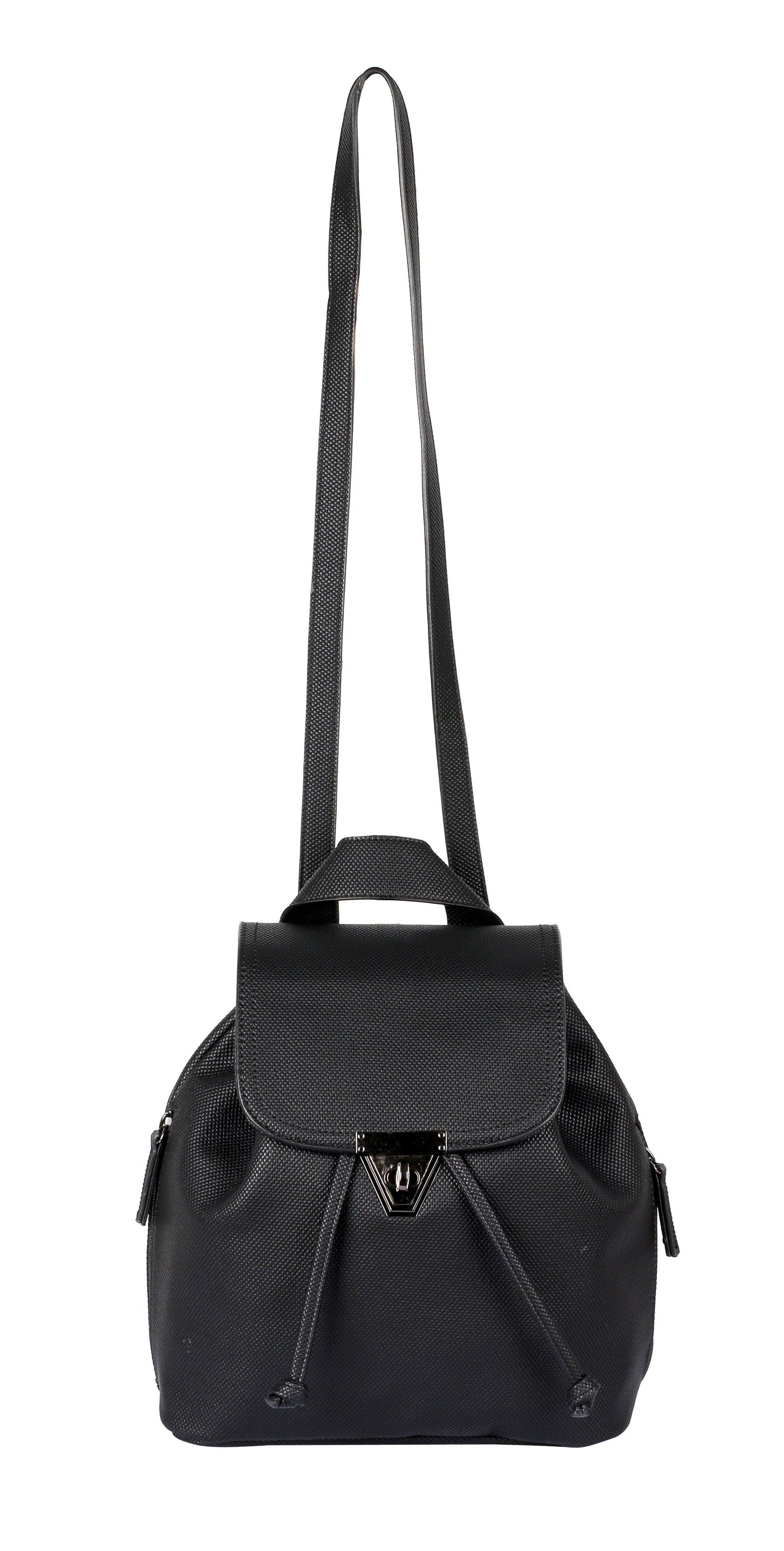The Hailey backpack is chic and practical in equal measure, featuring a versatile, compact design. The draw string increases the bag's carrying capacity while the hardware lock insures safety. Two side zipper pockets adds organization elements as well as playfulness. Featuring water-resistant textural vegan leather, with adjustable shoulder straps and a handle, the Hailey backpack can be carried any which way — on the back, over the shoulder and in the hand. It is a must-have accessory for easy everyday elegance.
